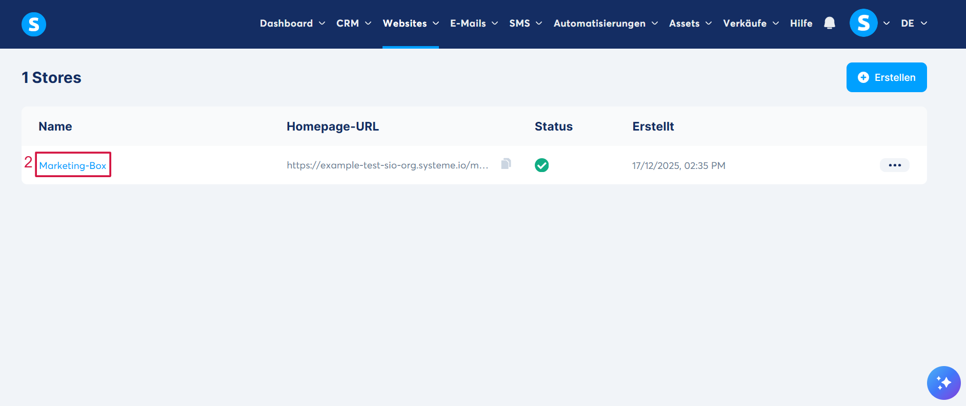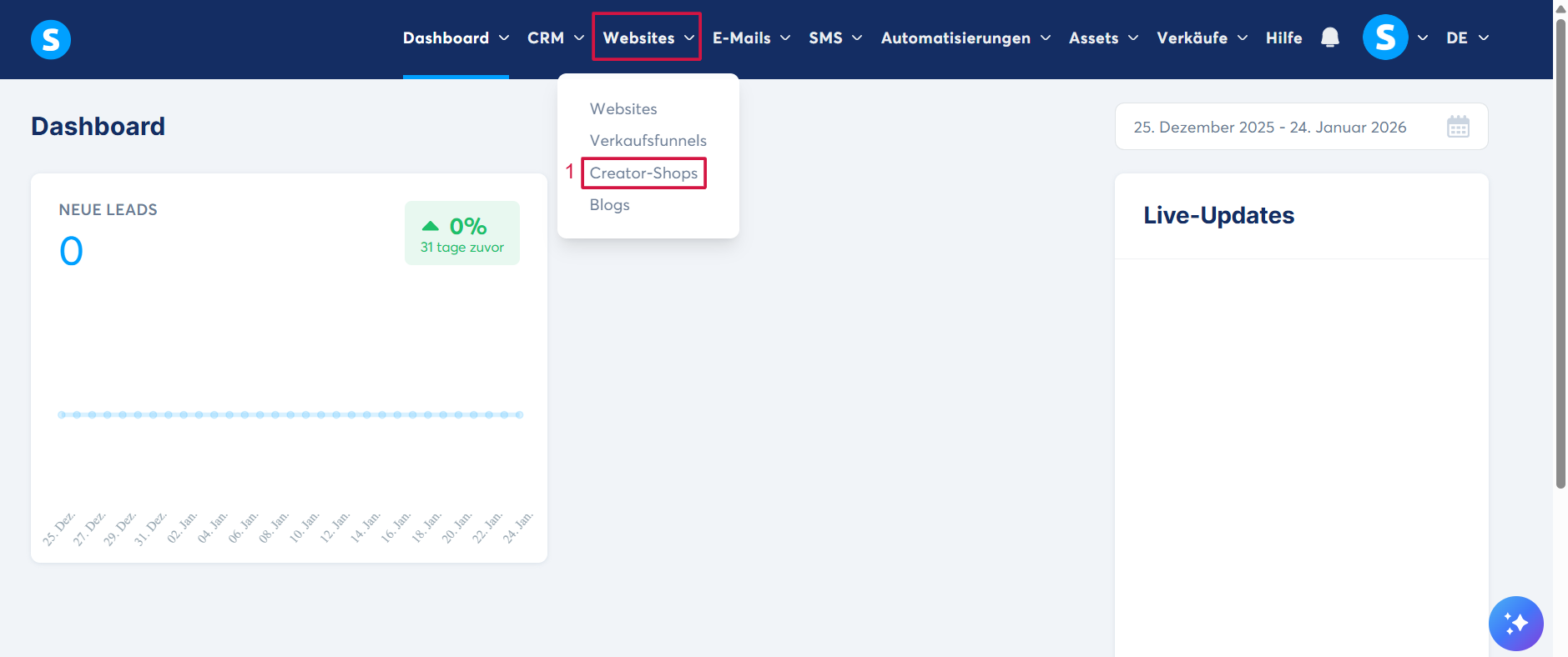 Gehen Sie zum Reiter Websites und klicken Sie auf Creator-Shops (1).