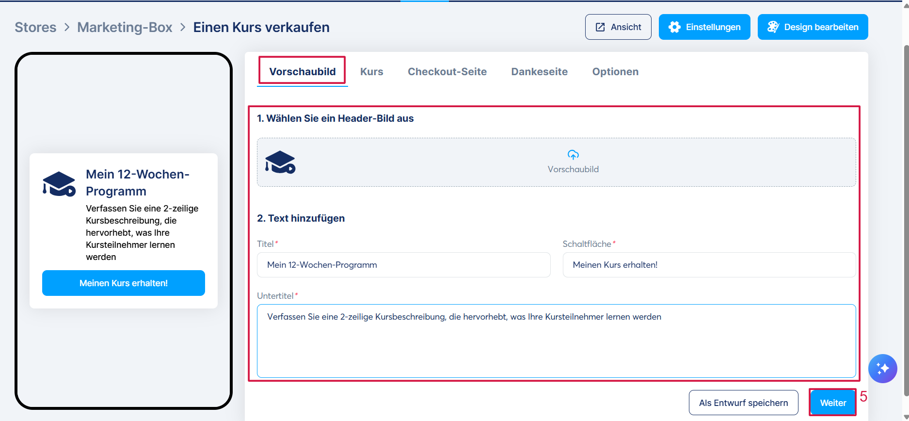 Im Vorschaubild-Tab passen Sie Ihr Header-Bild, den Titel, den Button-Text und den Untertitel an.