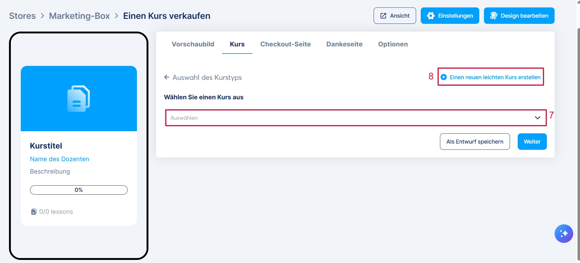 Wählen Sie einen vorhandenen Kurs aus (7) oder klicken Sie auf Einen neuen leichten Kurs erstellen (8).