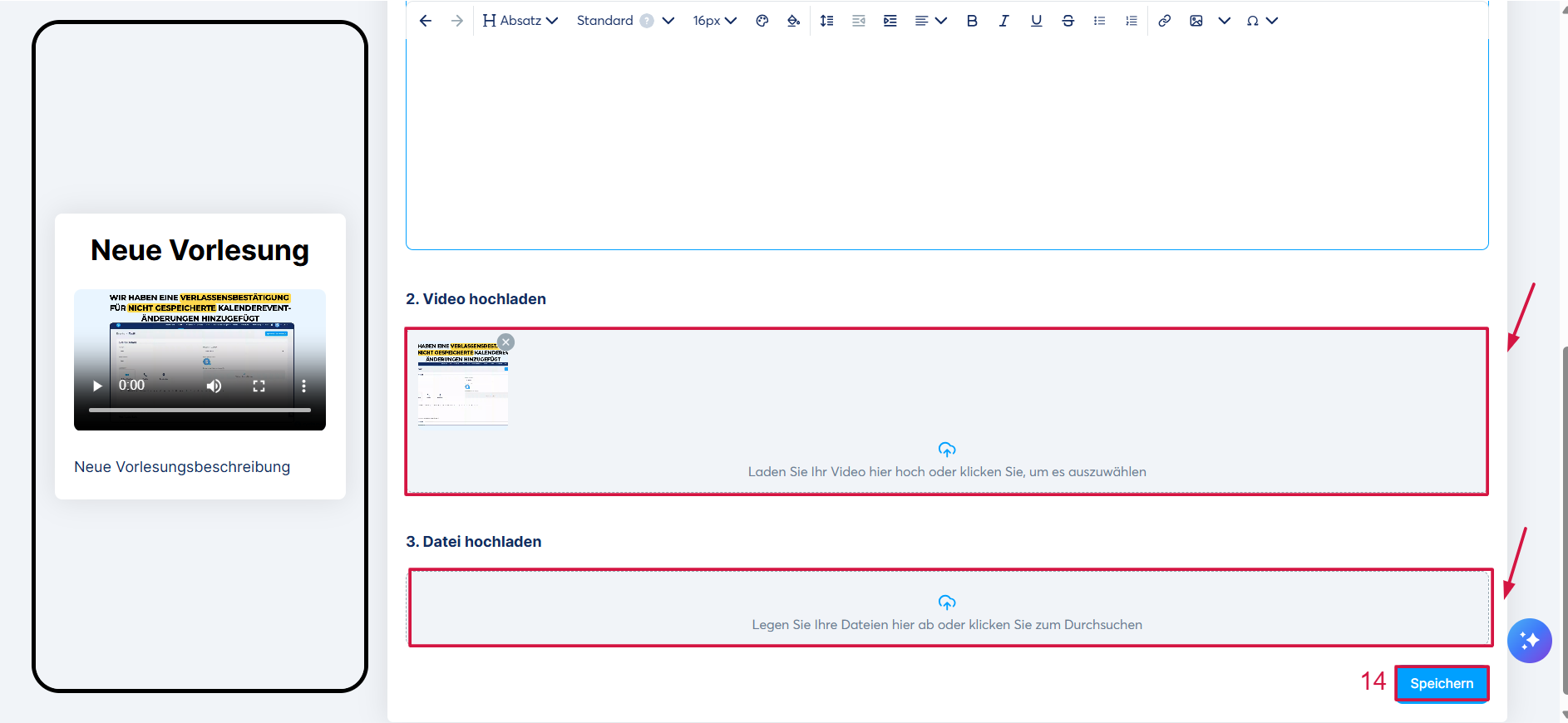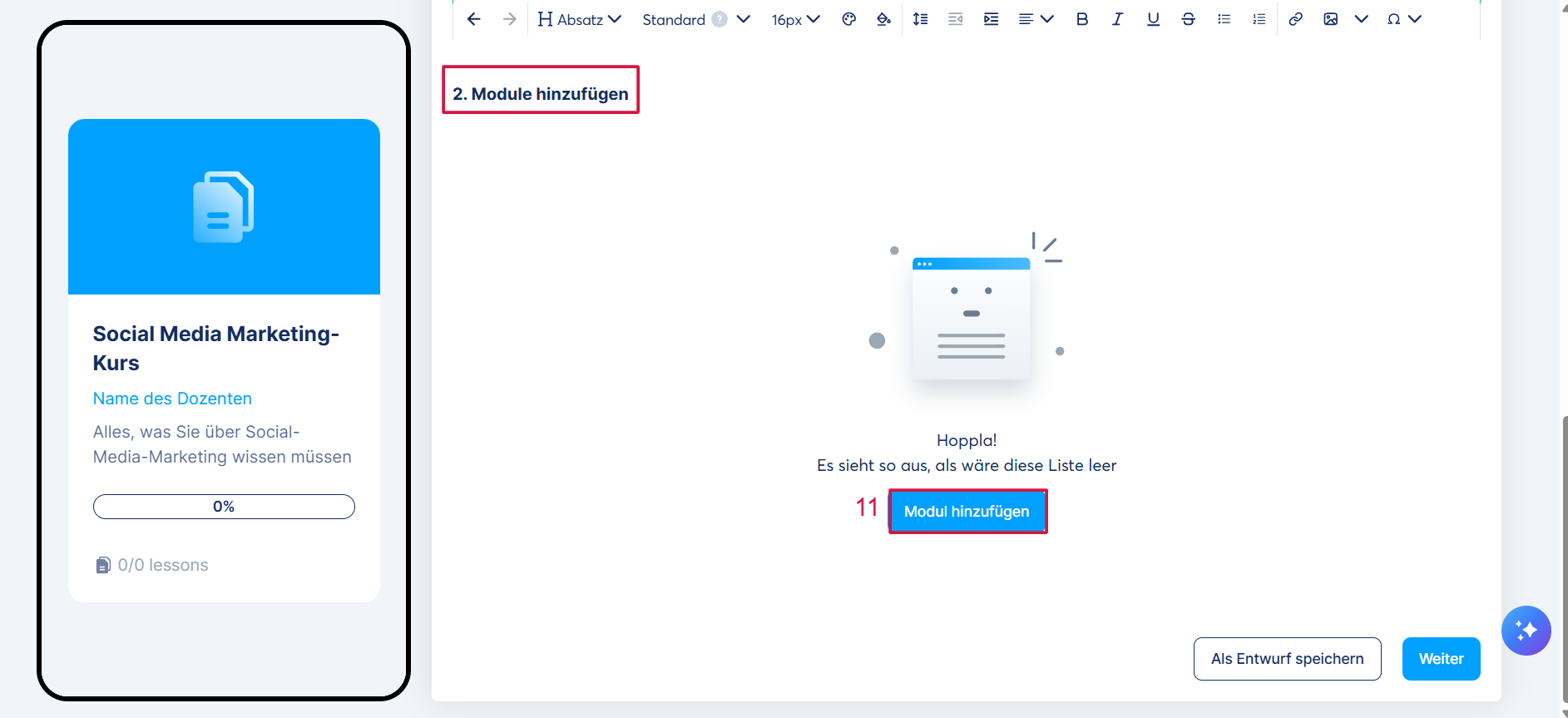 Ihre erste Vorlesung ist bereit! Um ein Modul oder eine Vorlesung zu bearbeiten, klicken Sie auf das Drei-Punkte-Menü (15) daneben.