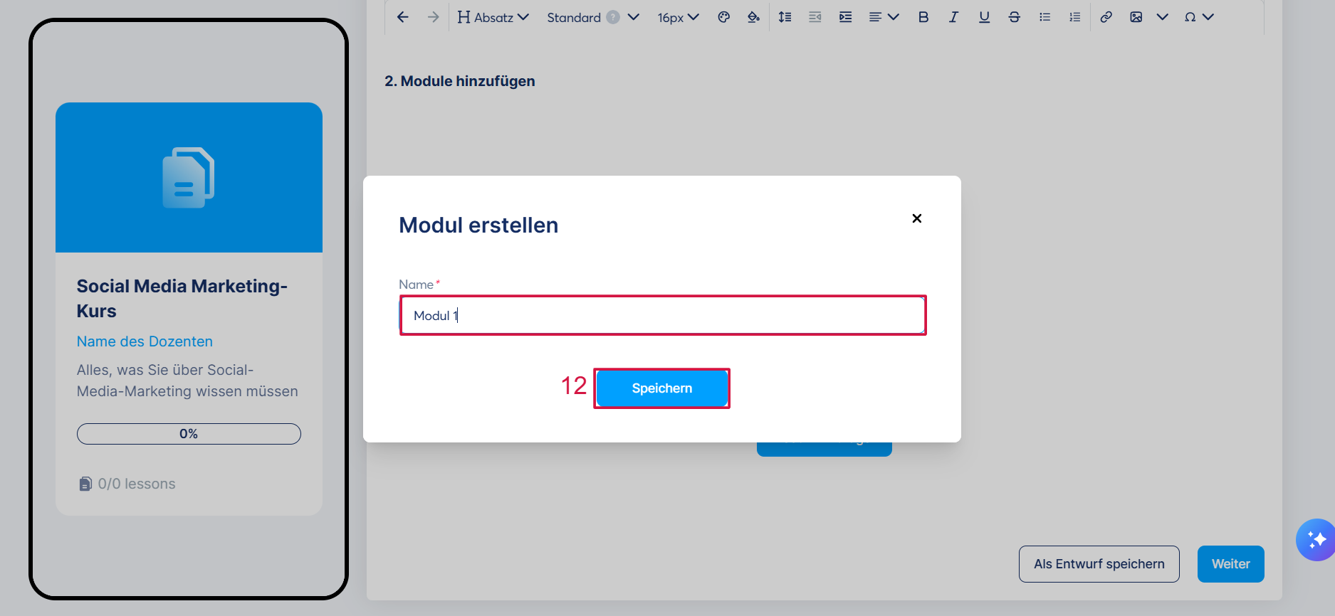 Geben Sie im Popup einen Namen für Ihr Modul ein und klicken Sie auf Speichern (12).