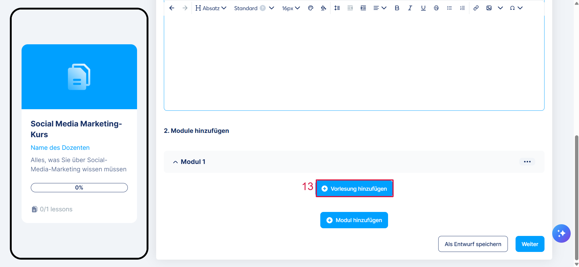 Klicken Sie auf Vorlesung hinzufügen (13), um Inhalte zum Modul hinzuzufügen.
