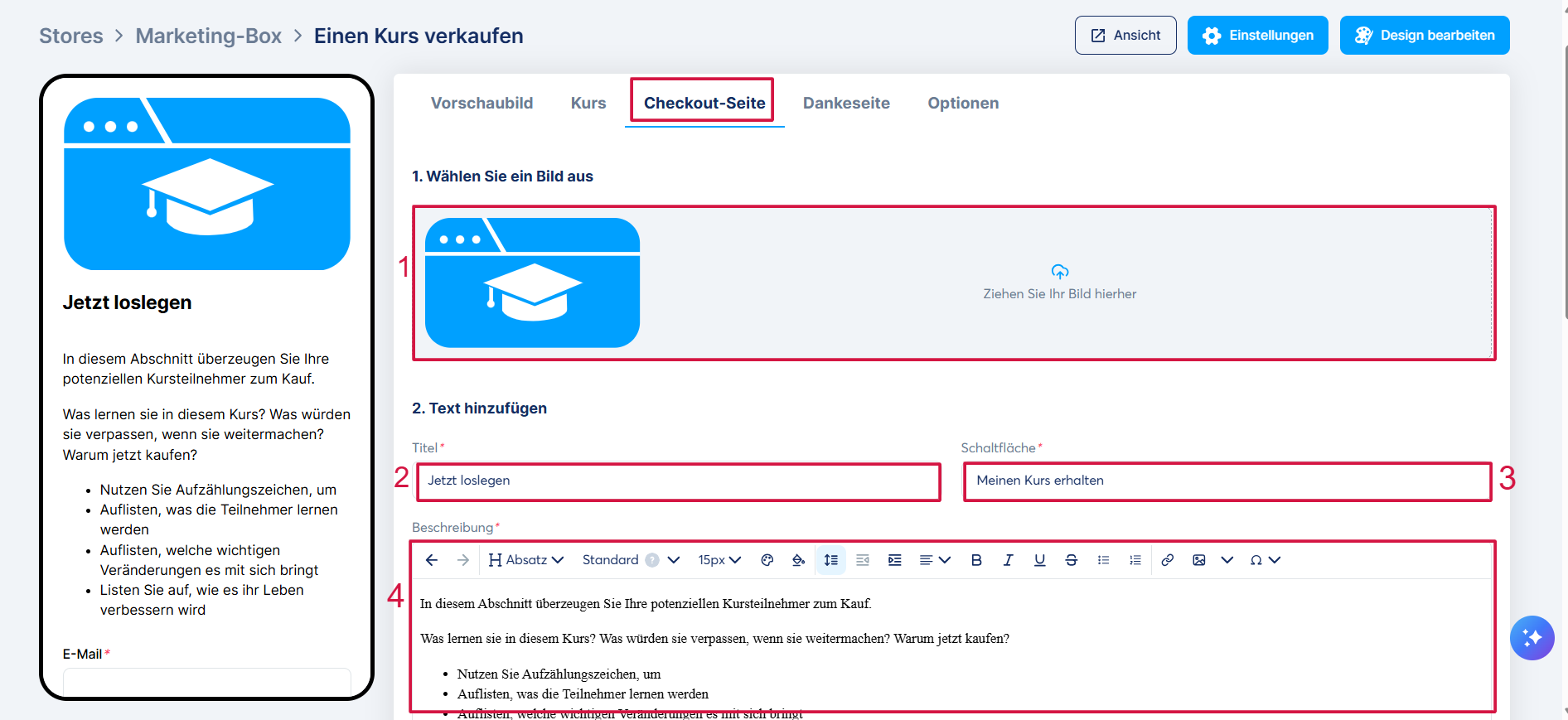 Klicken Sie auf Weiter, um die Checkout-Seiteneinstellungen zu öffnen. Hier müssen Sie Bild (1), Titel (2), Button-Text (3) und Beschreibung (4) festlegen.