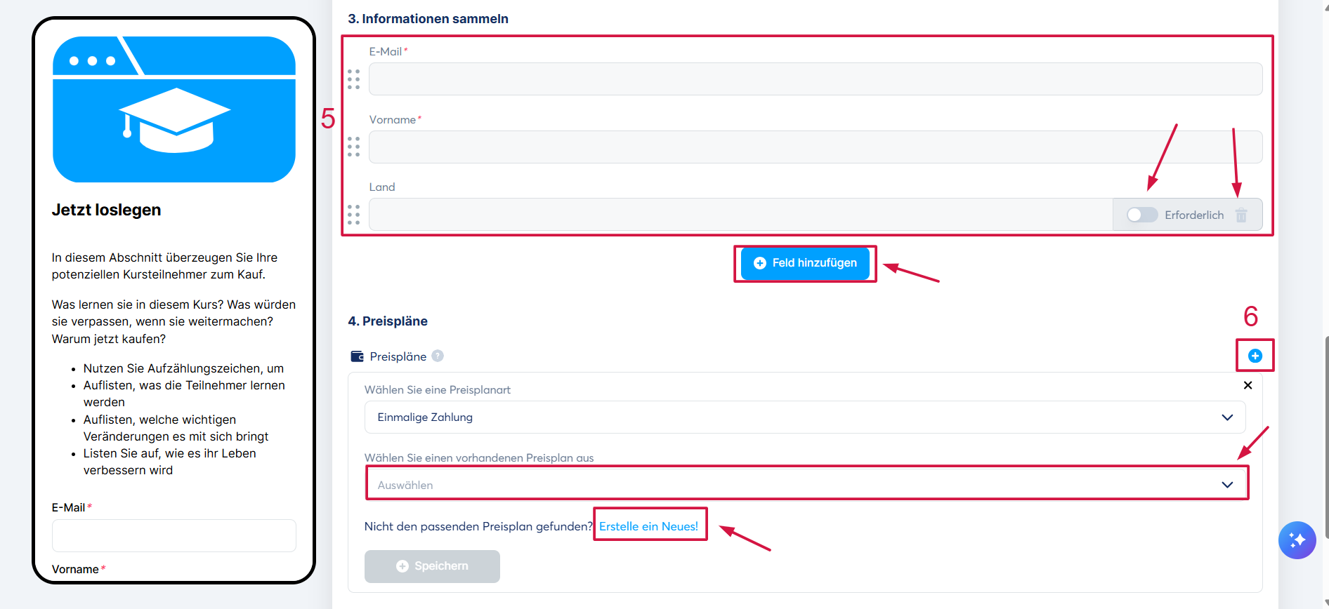 Unter Infos sammeln wählen Sie aus, welche Kundendaten abgefragt werden sollen (5). Klicken Sie auf Felder hinzufügen, um bei Bedarf weitere Felder hinzuzufügen.
