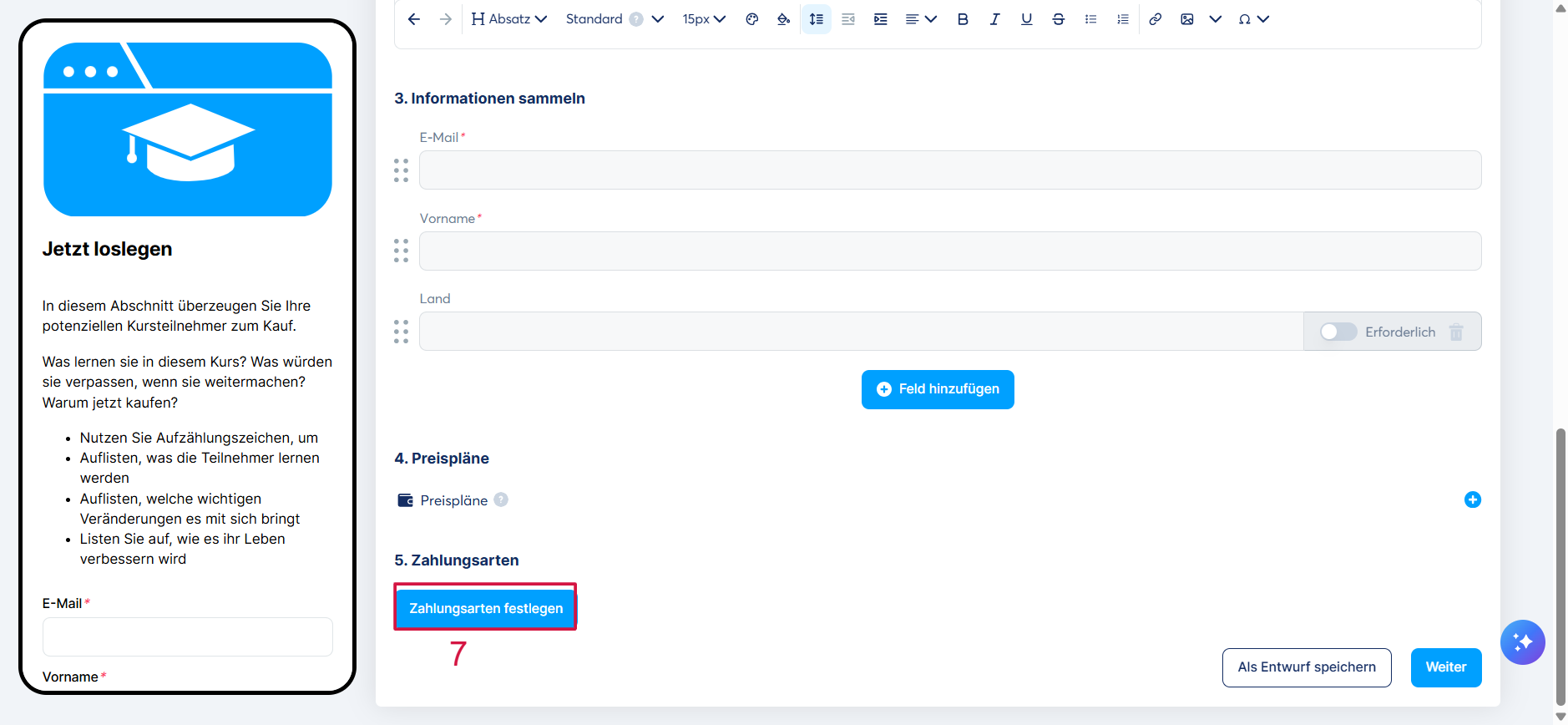 Klicken Sie auf Zahlungsmethoden festlegen (7), um Währung und Zahlungsanbieter zu konfigurieren.
