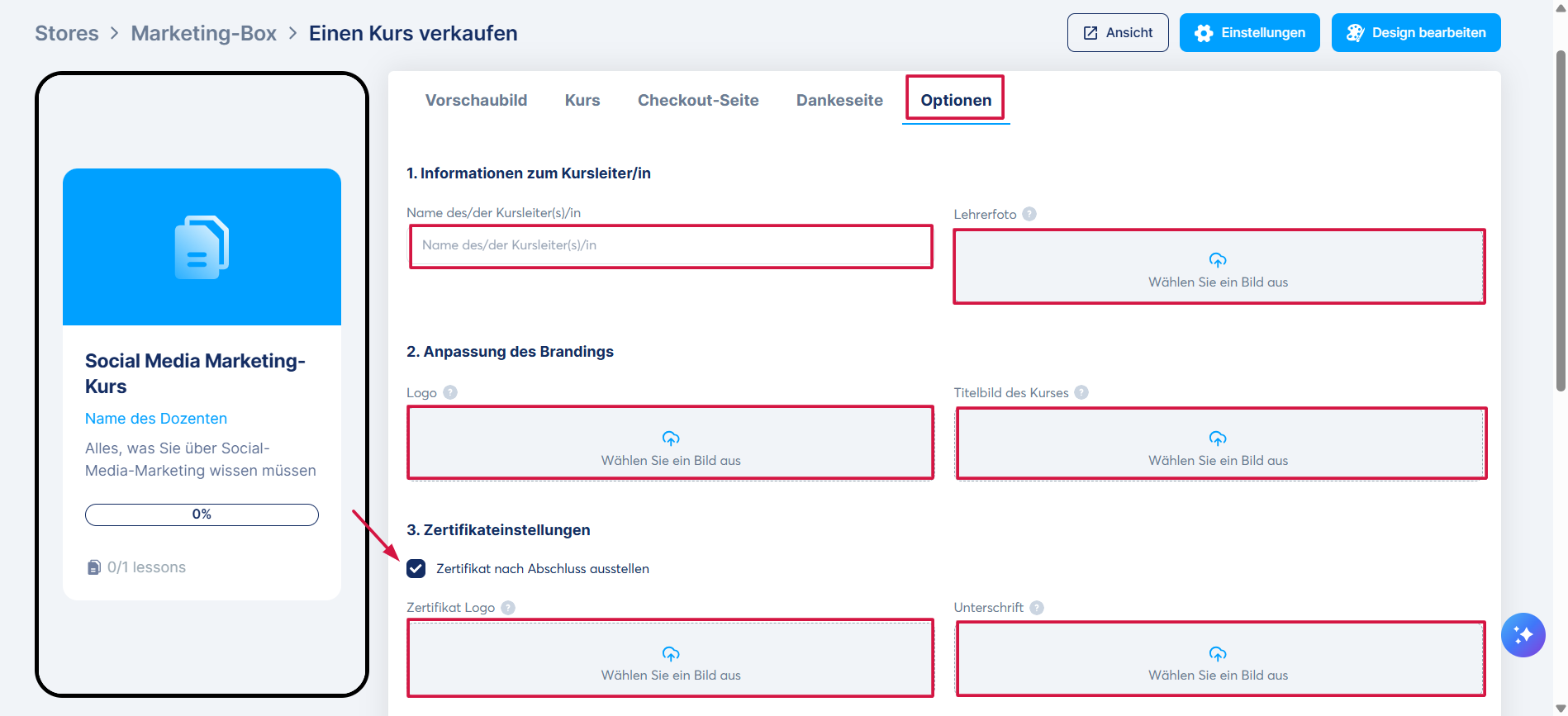 Verwenden Sie schließlich den Tab Optionen, um das Instruktor-Profil, Branding (Logo und Cover) sowie Zertifikat-Einstellungen anzupassen.