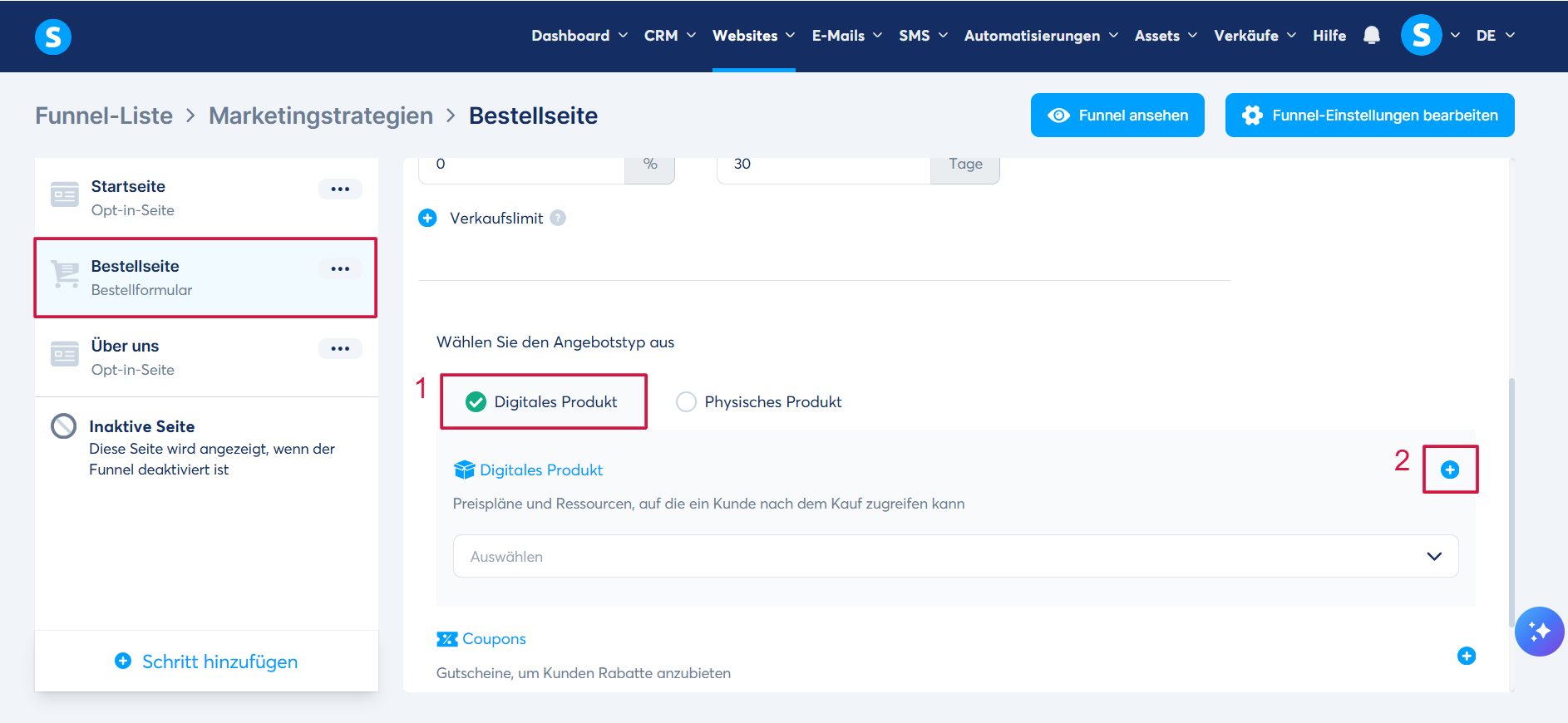 Wählen Sie in Ihrem Order-Form-Schritt Digitales Produkt (1) aus und klicken Sie auf das Plus-Symbol (+) (2).