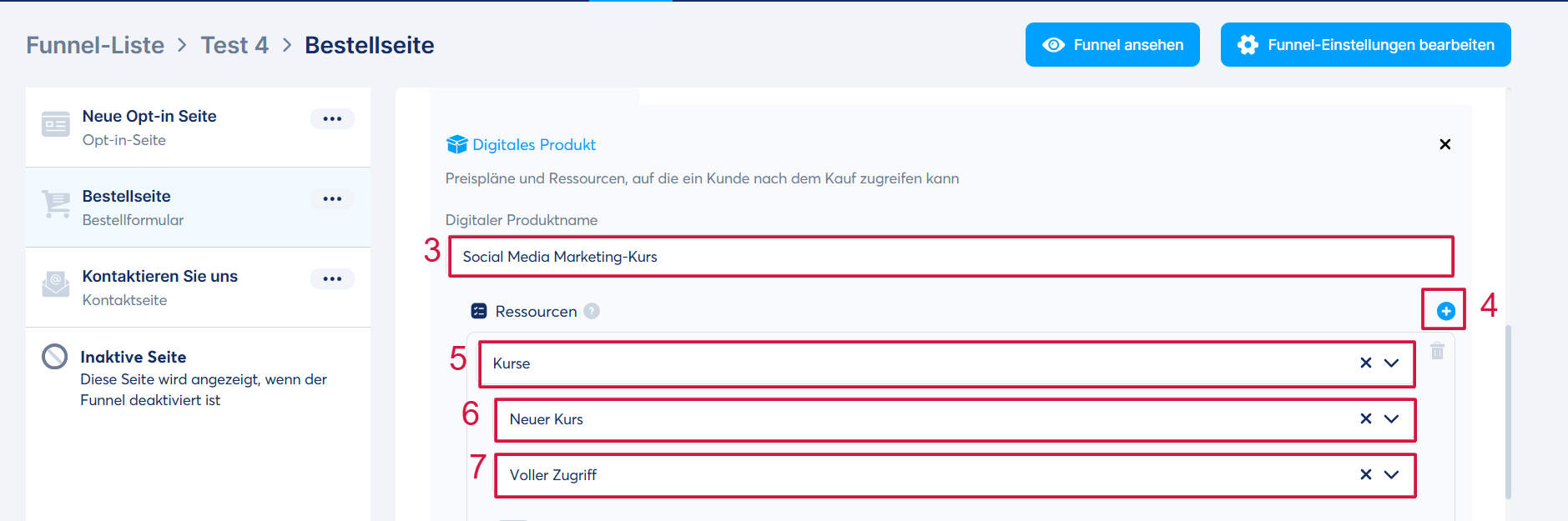 Benennen Sie das Produkt (3) und klicken Sie dann unter Ressourcen auf das Plus-Symbol (+) (4).