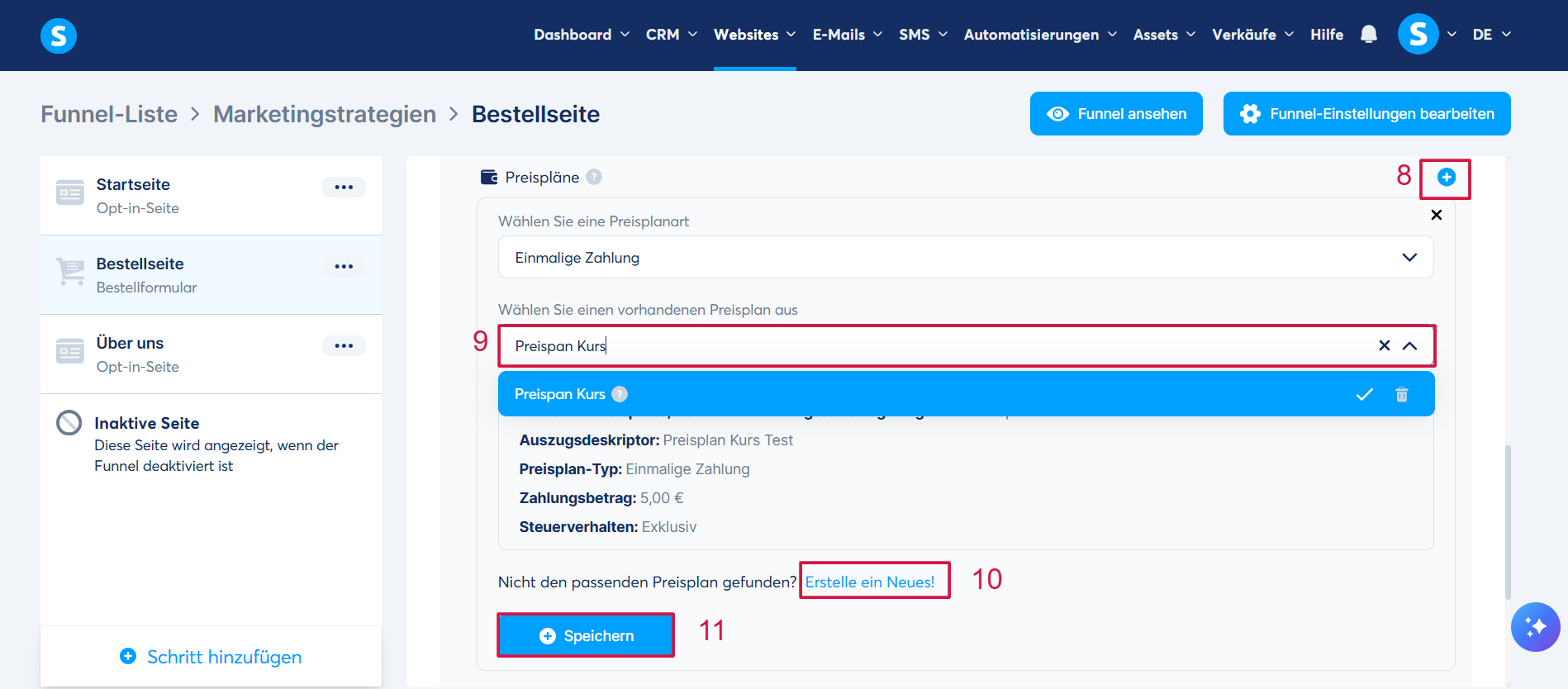 Klicken Sie auf das Plus-Symbol (+) (8). Wählen Sie einen bestehenden Preisplan (9) oder klicken Sie auf Neuen erstellen (10).