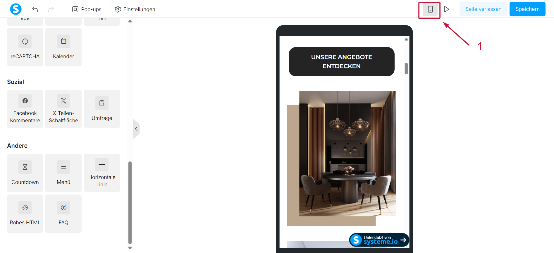 Um dies im Editor Ihrer Seite zu tun, klicken Sie einfach auf das Mobiltelefon-Symbol, um auf den mobilen Editor Ihrer Seite zuzugreifen (1).