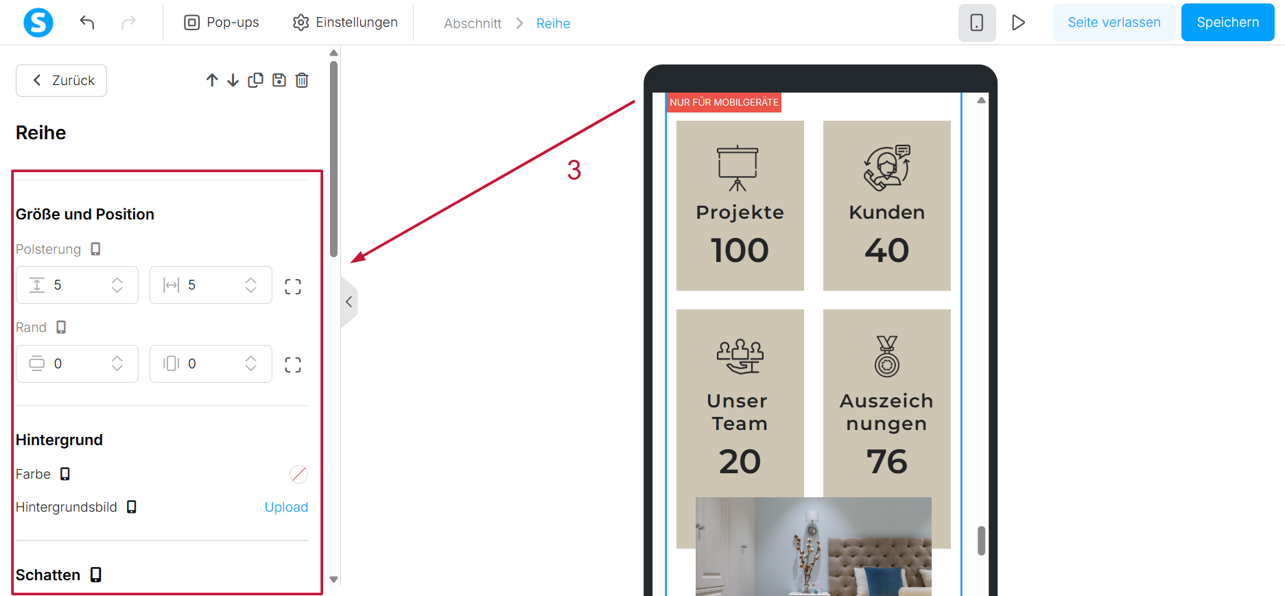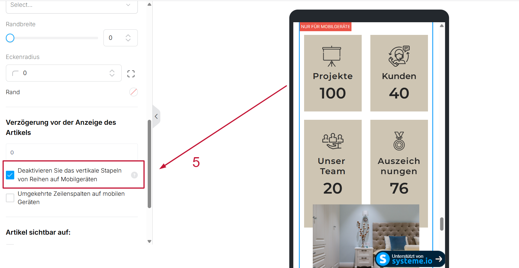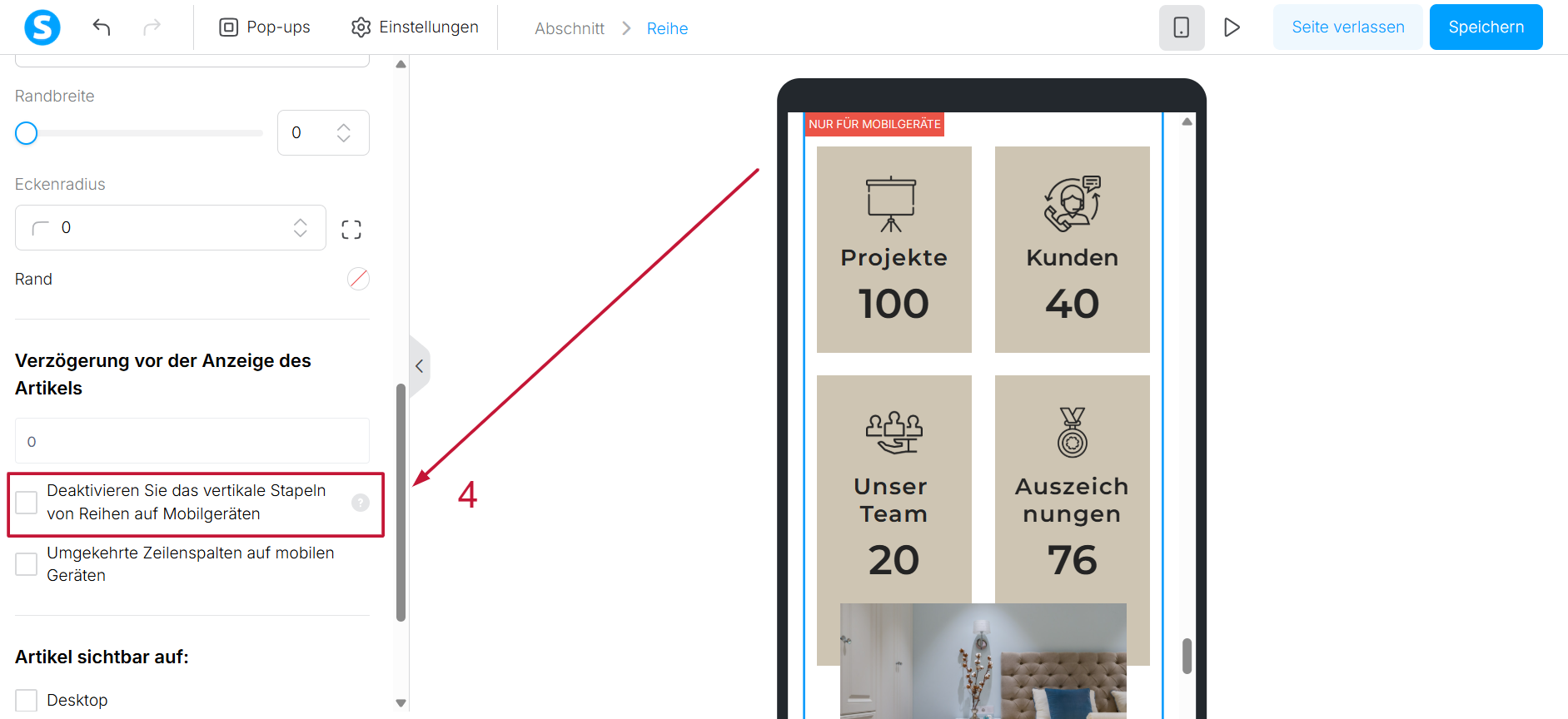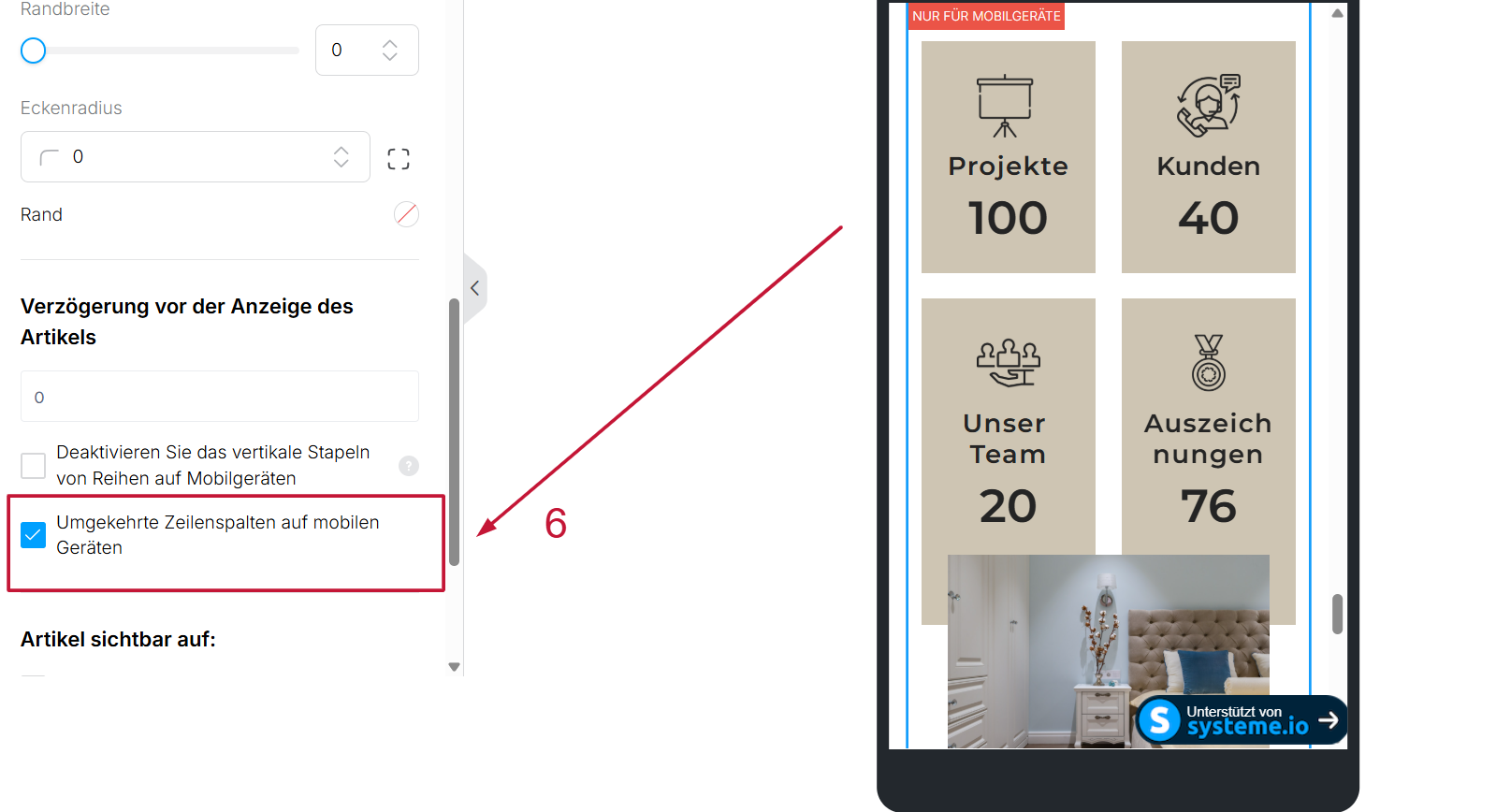 Sie haben außerdem die Möglichkeit, die Spalten einer Zeile auf Mobilgeräten umzukehren. Dazu müssen Sie lediglich das entsprechende Kästchen aktivieren (6).