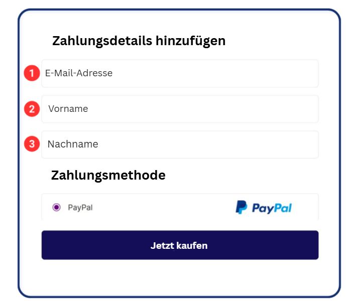 Hinweis: Um Zahlungen über PayPal zu verarbeiten, müssen Sie die Felder E-Mail (1), Vorname (2) und Nachname (3) in allen Ihren Bestellformularen hinzufügen